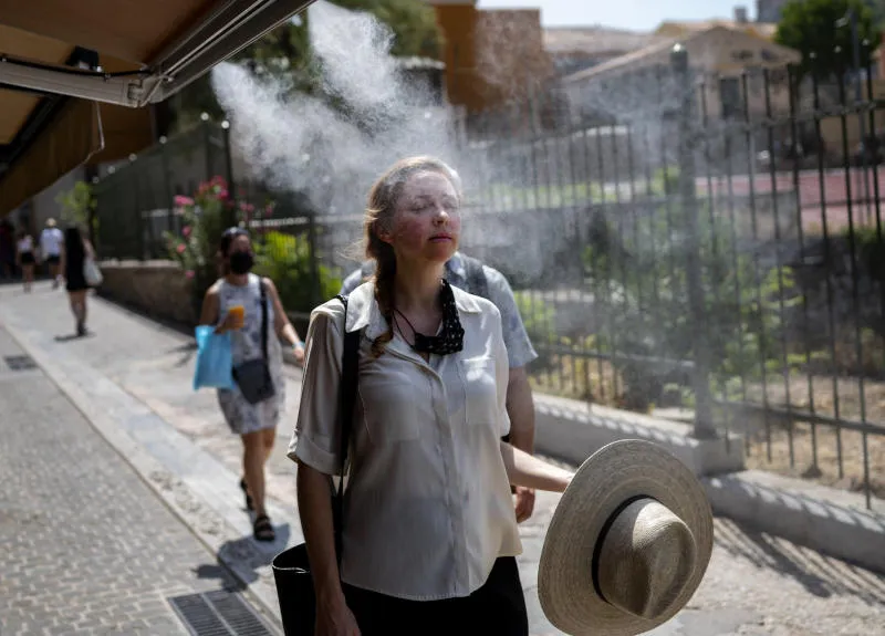 سياح يترطبون بماء يجري رشه خارج مقهى في أثينا حيث بلغت الحرارة 40 درجة مئوية (د.ب.أ)