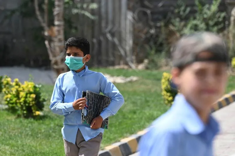 طفل أفغاني في المدرسة يسير على ممر مشاة في كابل (أ.ف.ب)