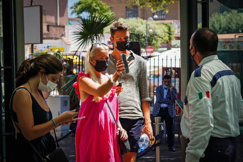زوار يُشهرون «جواز مرور أخضر» قبل زيارة المواقع الأثرية في بوميي الإيطالية (إ.ب.أ)