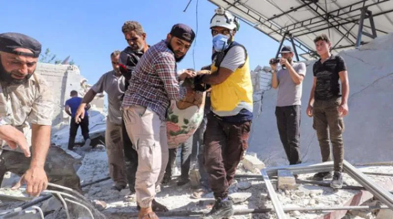 عناصر من «الدفاع المدني» يحملون قتيلاً بعد قصف قوات النظام لريف إدلب (أرشيفية - أ.ف.ب)