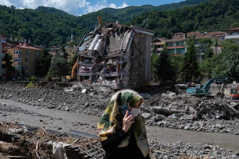 امرأة تسير أمام مبانٍ منهارة بسبب السيول في إقليم كاستامونو بتركيا (أ.ف.ب)