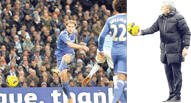مورينهو نجح في إدارة فريقه أمام سيتي (أ.ب) - إيفانوفيتش مدافع تشيلسي يصوب بقوة نحو مرمى سيتي ليمنح فريقه هدف الفوز (أ.ب)