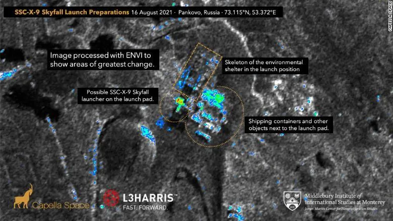 الصور، التي تم التقاطها في 16 أغسطس (آب) من شركة التصوير بالأقمار الصناعية التجارية «كابيلا سبيس»، تقدم «مؤشرات قوية على أن روسيا تستعد لاختبار صاروخ كروز يعمل بالطاقة النووية» في موقع إطلاق معروف بالقرب من الدائرة القطبية الشمالية، وفقاً لخبراء في مركز «ميدلبري» للدراسات الدولية لحظر انتشار الأسلحة النووية الذين قاموا بتحليل الصور.