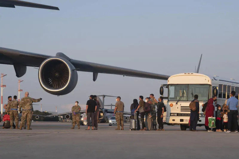قوات أميركية تساعد مجموعة من الأفغان الواصلين من كابل إلى ألمانيا (أ.ب)