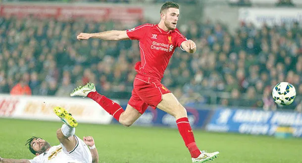 هندرسون لاعب ليفربول يتابع الكرة التي اصطدمت بقدمه من مدافع سوانزي وهي في طريقها للشباك (إ.ب.أ)