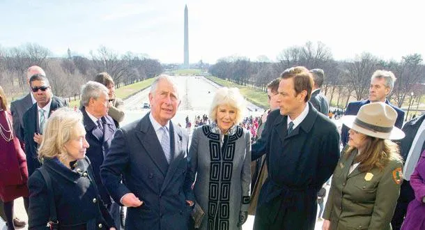 ولي العهد البريطاني الأمير تشارلز وزوجته كاميلا أثناء زيارتهما لنصب لنكولن التذكاري في واشنطن أمس (أ.ف.ب)