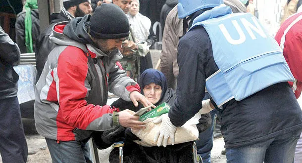 مساعدات غذائية من «الأونروا» توزع على سكان مخيم اليرموك جنوب دمشق أمس (رويترز)