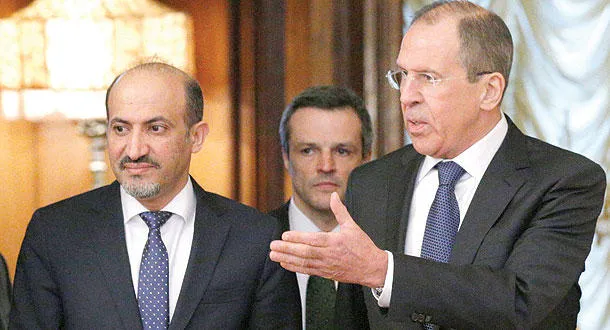 لافروف والجربا خلال لقائهما في موسكو أمس (أ.ب)