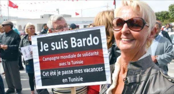 سياح أوروبيون شاركوا في مظاهرات ضد الإرهاب أمس وفي الصورة امرأة تحمل لافتة باللغة الفرنسية تقول: «أنا باردو وسأقضي الصيف المقبل في تونس» في جزيرة جربة التونسية أمس (أ.ف.ب)