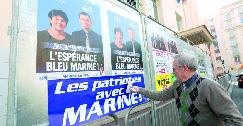 مناصر للجبهة الوطنية (اليمين المتطرف) يضع إعلانا انتخابيا مكتوبا عليه «الوطنيون مع مارين» في مدينة نيس عشية الانتخابات المحلية (رويترز)