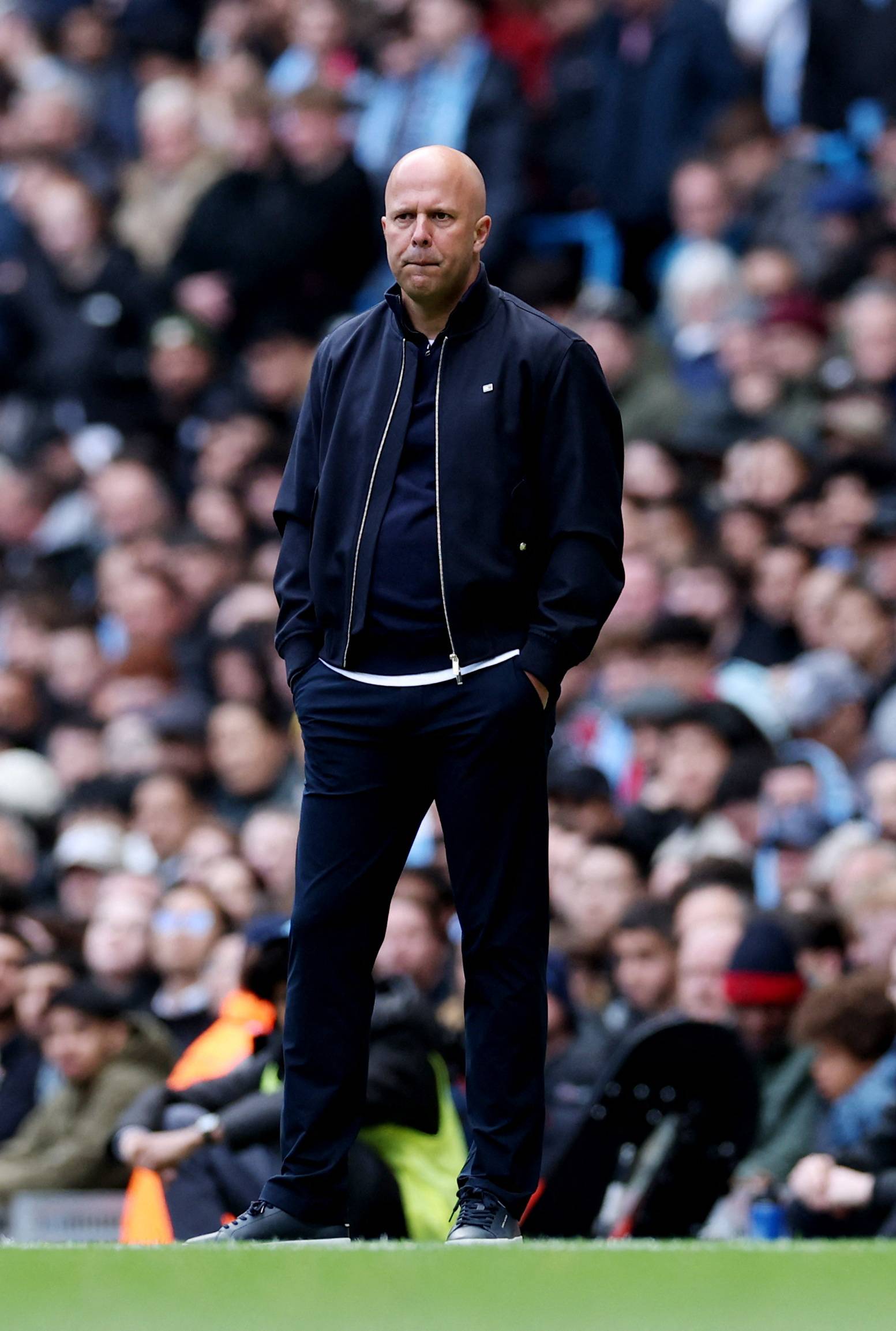 سلوت مدرب ليفربول يتابع هزيمة ليفربول المذلة أمام سيتي (رويترز)