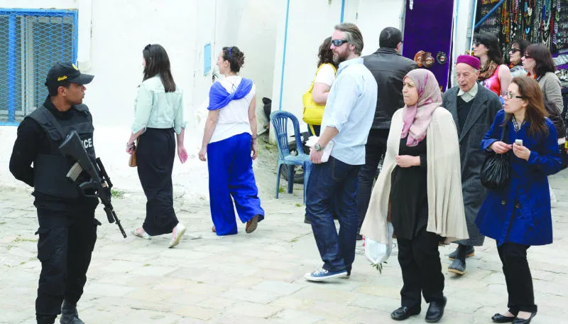 جندي تونسي في أحد شوارع مدينة بوسعيد التونسية بينما السياح والمواطنون يمرون من حوله في أمن وهدوء (أ. ف. ب)