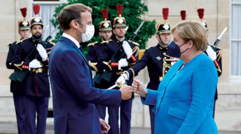 ماكرون يستضيف حليفته ميركل في الإليزيه الخميس... واختلفت ميركل مع بايدن بخصوص خط أنابيب الغاز الروسي والآن جاء دور ماكرون الذي يشعر بخيبة أمل من الحلف الأنغلوساكسوني الجديد (أ.ف.ب)