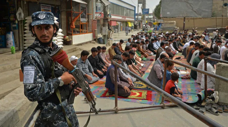 مقاتل من «طالبان» خلال صلاة الجمعة في كابل أمس (أ.ف.ب)