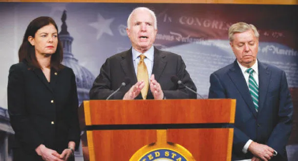 السناتور الجمهوري جون ماكين يعقد مؤتمرا صحافيا برفقة السناتورة كيلي ايوت والسناتور ليندزي غراهام في واشنطن أمس للحديث عن التحالف الدولي في اليمن (أ.ب)