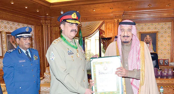 الأمير سلمان بعد تقليده قائد الجيش الباكستاني وسام الملك عبد العزيز من الدرجة الممتازة (واس)