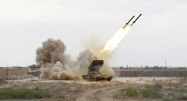 القوات العراقية تطلق صاروخين على مواقع «داعش» في تكريت أمس (رويترز)
