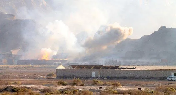 دخان يتصاعد من مخازن أسلحة بعد تفجيرات شهدتها عدن أمس (أ.ف.ب)