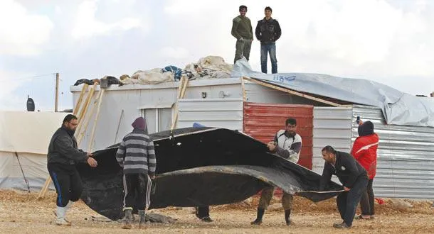 لاجئون سوريون في مخيم الزعتري يحاولون إعادة خيمة إلى وضعها الطبيعي بعد عاصفة (أ.ب)