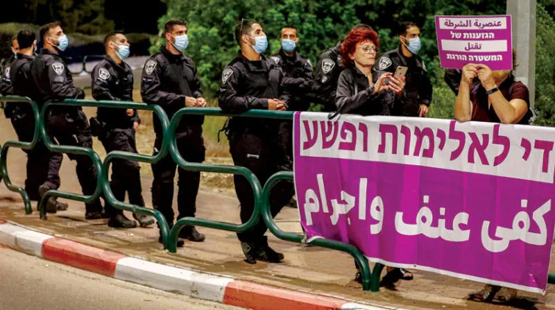 مظاهرة ترفع لافتات بالعربية والعبرية عن عنصرية الشرطة الإسرائيلية تجاه العنف داخل المنطقة العربية (أ.ف.ب)