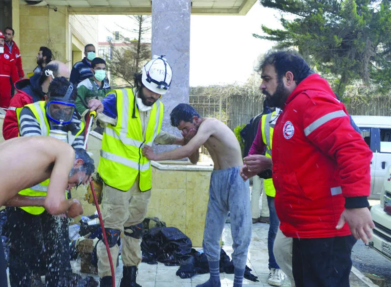 قوات الدفاع المدني ترش مقاتلي المعارضة في إدلب شمال سوريا بالماء بعد أن استهدف موقعهم بغاز الكلور مساء الثلاثاء (رويترز)