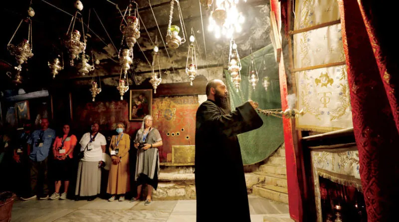 سياح أجانب صيف هذا العام داخل كنيسة المهد في بيت لحم بالضفة (رويترز)