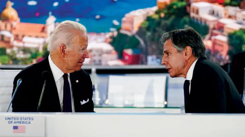 الرئيس الأميركي جو بايدن يتحدث إلى وزير خارجيته أنتوني بلينكن على هامش قمة العشرين في روما أمس (رويترز)