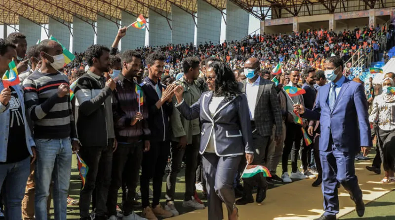 متطوعون إثيوبيون يتجمعون في «ملعب أبيبي بيكيلا» بالعاصمة أديس أبابا، بينما تودعهم عمدة المدينة أدانتش أبيبي. ويأتي هذا التجنيد وسط مساعٍ دولية لمنع تقدم متمردي «جبهة تحرير شعب تيغراي» إلى العاصمة (إ.ب.أ)
