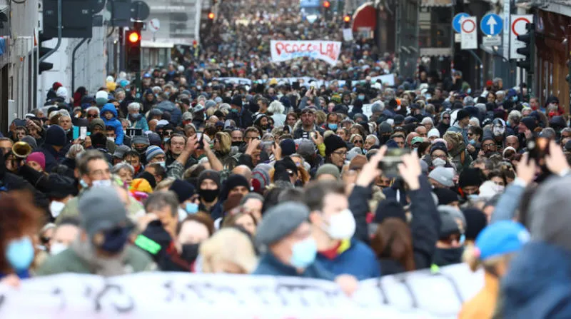 مظاهرات ضد الجواز الصحي في تريسته بإيطاليا أمس (رويترز)