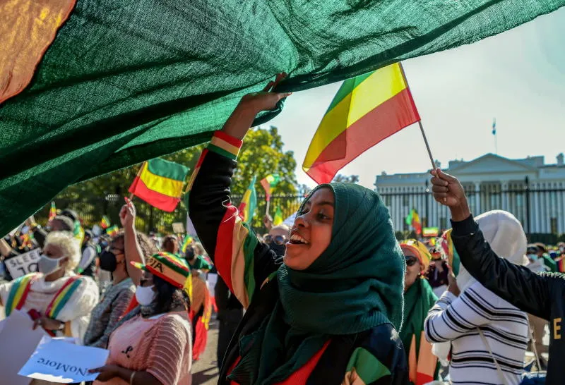 مظاهرة تنتقد موقف الولايات المتحدة من النزاع في إثيوبيا أمام البيت الأبيض بواشنطن (رويترز)