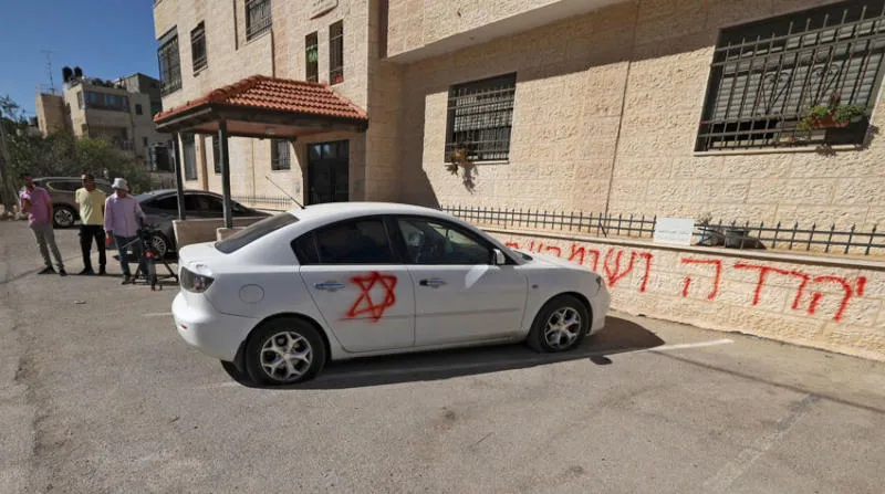 عبارات بالعبرية تروج لحروب بالضفة فاجأت سكان بلدة البيرة أمس (أ.ف.ب)