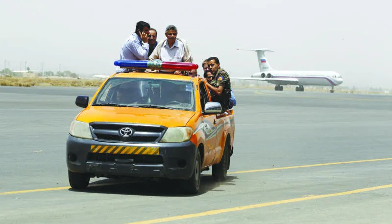 موظفون ورجال أمن في مطار صنعاء الدولي وتبدو طائرة روسية لإجلاء رعايا أجانب من اليمن أمس (إ.ب.أ)