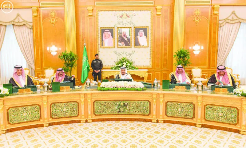 الملك سلمان بن عبد العزيز لدى ترؤسه جلسة مجلس الوزراء.. ويبدو الأمير سعود الفيصل وزير الخارجية والأمير مقرن ولي العهد والأمير محمد بن نايف ولي ولي العهد (واس)