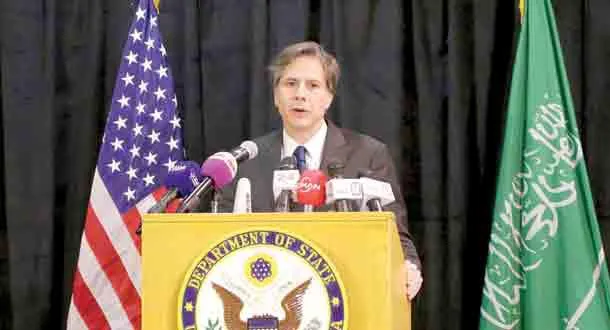 وأوضح بلينكين في مؤتمر صحافي عقده أمس بالرياض، أن المباحثات التي أجراها مع الأطراف السعودية والخليجية واليمنية، تناولت آخر التطورات في اليمن، بجانب حيثيات الاتفاق الذي توصلت إليه الأطراف الغربية مع إيران مؤخرا، في ما يتعلق بالبرنامج النووي الإيراني، بالإضافة إلى جهود دول التحالف الدولي لمواجهة تنظيم داعش.