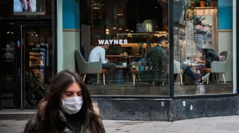 امرأة تسير وهي تضع كمامة وخلفها مقهى مزدحم بالزبائن في العاصمة السويدية استوكهولم (أ.ف.ب)