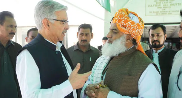 وزير الدفاع الباكستاني يتحدث مع مولانا فضل الرحمن زعيم حزب «جماعة علماء الإسلام» خارج مقر البرلمان الباكستاني أمس (أ.ب)