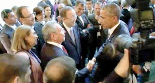 ْصنع الرئيسان الأميركي باراك أوباما والكوبي راؤول كاسترو حدثًا تاريخيًّا باجتماعهما الذي كان مرتقبًا مساء أمس على هامش قمة الأميركتين في بنما. وكانت قمة الأميركتين افتتحت بمصافحة بين الرئيسين وتبادل بضع كلمات مع ابتسامة، وهي الخطوة التي لاقت ترحيبًا واسعًا وسط قادة الدول المجتمعين.