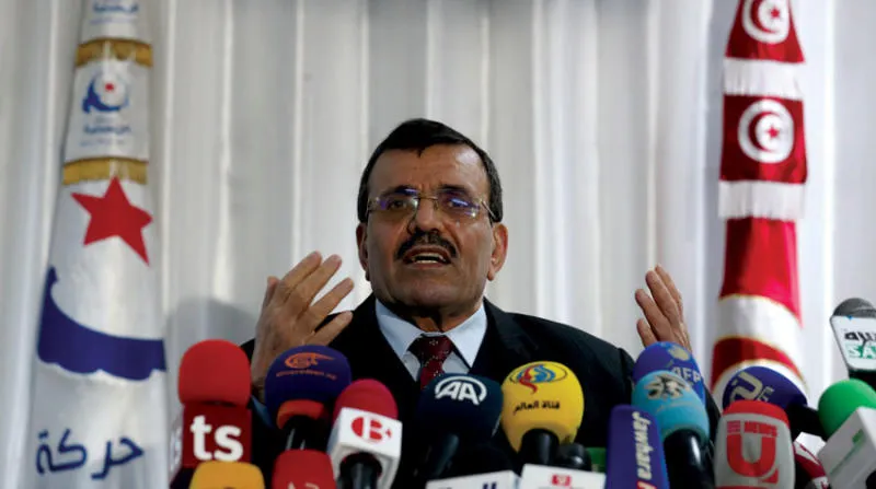 نائب رئيس «حركة النهضة» التونسية علي العريض خلال المؤتمر الصحافي في تونس أمس (إ.ب.أ)