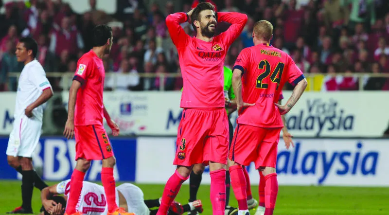 بيكيه مدافع برشلونة يندب حظه بعد الخطأ الذي أضاع الفوز من فريقه (أ.ب)
