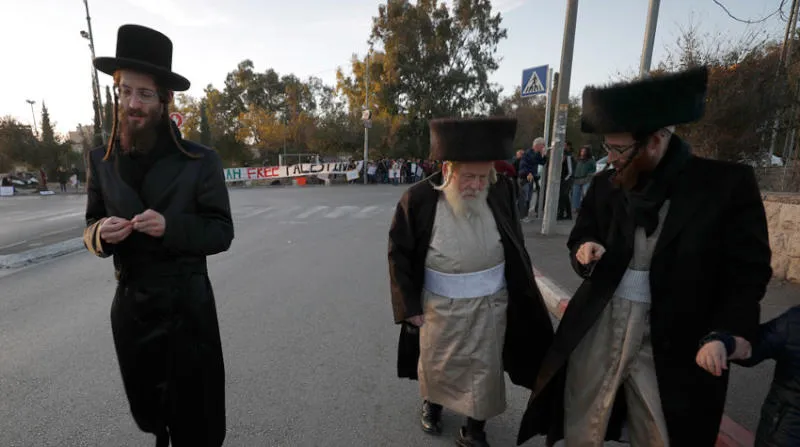 متدينون يهود يشاركون في مظاهرة أمس للاحتجاج على طرد فلسطينيين من منازلهم بضاحية الشيخ جراح بالقدس الشرقية (إ.ب.أ)
