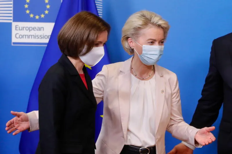 رئيسة المفوضة الأوروبية مع رئيسة مولدوفا على هامش المؤتمر (إ.ب.أ)