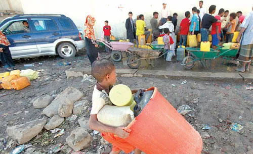 طفل يحمل وعاءين ليملأهما بالمياه في العاصمة صنعاء أمس (رويترز)