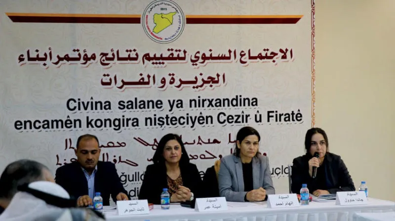 إلهام أحمد في مؤتمر «مسد» بمدينة الرقة (الشرق الأوسط)