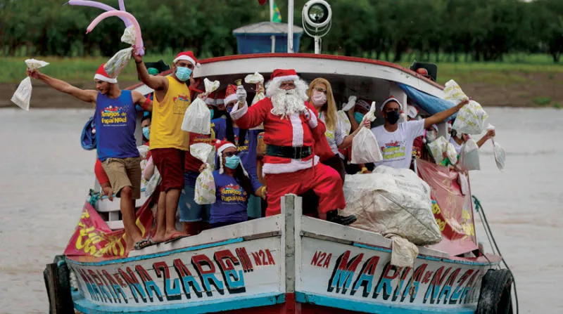 يهتف سانتا كلوز «عيد ميلاد مجيد!»، ويدق الجرس قبل أن ينزل من قاربه، في بلدة بارانا دا تيرا نوفا، التي تبعد 24 كيلومتراً من ماناوس، أكبر مدن الأمازون.