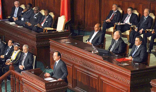 وخلال الجلسة البرلمانية المميزة التي خصصت للاحتفال بالدستور التونسي الجديد، عبر الرئيس الفرنسي فرنسوا هولاند، الذي يشارك تونس احتفالاتها عن مساندته لـ«أصدقائه في تونس» ودعا إلى الإسراع بتنظيم انتخابات رئاسية وبرلمانية بعد النجاح في تشكيل الحكومة والتصديق على الدستور.