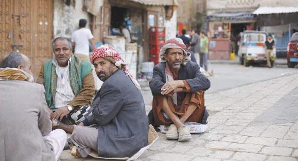 يمنيون يجلسون على قارعة الطريق في صنعاء أمس (رويترز