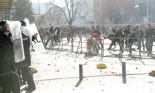قوات مكافحة الشغب تحاول صد حشد من المتظاهرين أمام مقر للحكومة المحلية في توزلا أمس (أ.ب)