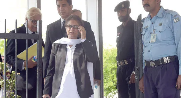 الناشطة الحقوقية أسماء جهانغير التي قدمت طلبا ضد المحاكم العسكرية لدى مغادرتها مبنى المحكمة العليا في إسلام آباد بعد صدور القرار أمس (أ.ف.ب)