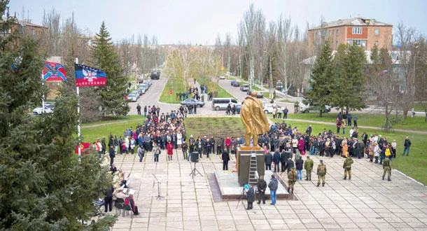 حشد من الناس أثناء احتفال نظم بمناسبة إزاحة الستار عن نصب للينين في دونيتسك بشرق أوكرانيا أمس (أ.ف.ب)