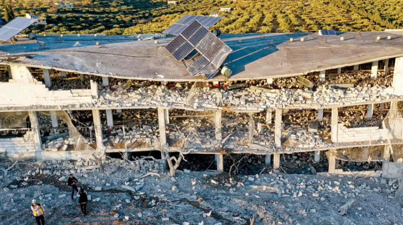 مبنى أصيب في قصف روسي يوم الأحد في بلدة كفرتخاريم بريف إدلب شمال غربي سوريا (أ.ف.ب)